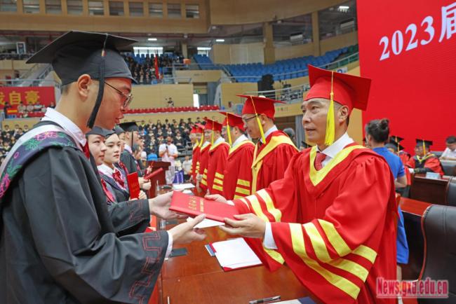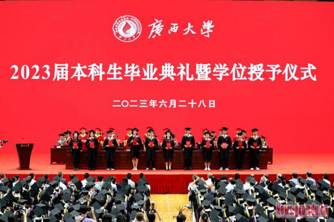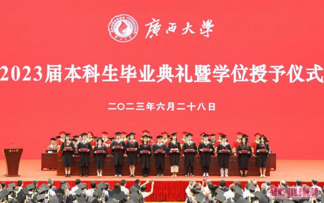 On June 28th,2023, Guangxi University held the graduation ceremony and degree awarding ceremony for the 6,005 undergraduate students of 2023. Wang Naixue (Vice Chairman of the Political Consultative Conference of Guangxi Zhuang Autonomous Region and Secretary of the CPC Guangxi University Committee), Li Jibing (Liaison officer of the Party Building of the Ministry of Education), Han Linhai (Deputy Secretary of the CPC Guangxi University Committee, President of Guangxi University ), Lv Yi (Secretary of the Discipline Inspection Commission of CPC Guangxi University Committee), Ma Shaojian, Fan Zuojun,Liu Xiang, Tian Lihui, Xiao Jianzhuang (all Vice Presidents), Ning Xuchu (Chief Accountant), Zhao Shuangliang (Assistant Principal, Vice Provost, Director of the Development Planning Division), members of the University Academic Degree Evaluation Committee, teacher representatives, Alumni representatives and graduate representatives attended the ceremony. Feng Jiaxun (Vice President and Provost) presided over the ceremony.