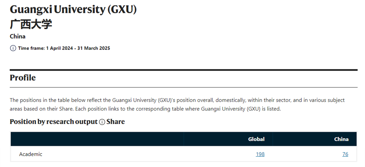 Việc thăng hạng trong Chỉ số Nature là thể hiện quan trọng cho những thành quả trong công tác xây dựng “Kép hạng nhất” của trường. Những năm gần đây, Đại học Quảng Tây kiên định mục tiêu xây dựng “Kép hạng nhất”, tập trung vào nhu cầu chiến lược trọng đại quốc gia và các lĩnh vực khoa học tiên tiến, triển khai sâu rộng “Mười công trình phấn đấu xây dựng toàn diện hạng nhất” cùng mười sáng kiến đổi mới, đồng bộ thúc đẩy cải cách thể chế cơ chế giáo dục – khoa học – nhân tài, mạnh mẽ thúc đẩy liên ngành, tối ưu hóa phân bổ nguồn lực, thành lập các nhóm nghiên cứu đổi mới khoa học công nghệ trình độ cao, chú trọng xây dựng hệ thống nền tảng nghiên cứu khoa học “cấp quốc gia – cấp tỉnh, bộ – cấp trường”, tăng cường nghiên cứu khoa học mũi nhọn có tổ chức, không ngừng khơi dậy sức sống đổi mới sáng tạo khoa học công nghệ. Đại học Quảng Tây đã đạt được một loạt thành tựu đột phá trong nhiều lĩnh vực khoa học, hiện có 12 ngành lọt vào top 1% xếp hạng ESI toàn cầu, bao gồm kỹ thuật công trình, khoa học vật liệu, khoa học nông nghiệp, khoa học thực vật và động vật, hóa học v.v., trong đó ngành kỹ thuật đứng trong top 0.7‰ toàn cầu ESI. Nhà trường luôn lấy việc phục vụ nhu cầu chiến lược trọng đại của quốc gia và thúc đẩy phát triển chất lượng cao của khu vực làm sứ mệnh của mình, nhấn mạnh định hướng đóng góp và định hướng kết quả, triển khai hành động phục vụ phát triển quốc gia gắn với thực tiễn Quảng Tây, thông qua thiết lập các dự án nghiên cứu liên ngành, thúc đẩy phát triển cụm ngành, tích cực đảm nhiệm các dự án trọng điểm cấp quốc gia và các công trình, dự án phục vụ chiến lược quốc gia và phát triển khu vực, và đẩy mạnh tiến trình gắn kết sâu rộng giữa sản xuất – học tập – nghiên cứu và chuyển giao kết quả, không ngừng nâng cao năng lực phục vụ chiến lược quốc gia và nhu cầu khu vực, tạo nền tảng vững chắc cho việc xây dựng “Kép hạng nhất” mang đặc sắc Trung Quốc, tạo nền tảng vững chắc trên vùng đất Quảng Tây.
