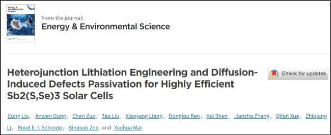 Recently, Professor Zou Bingsuo from GXU School of Resources, Environment and Materials has led his team to make further/significant progress in the research field of Selenium-Sulfur-Antimony solar cells. The relevant research findings, titled "Heterojunction Lithiation Engineering and Diffusion-Induced Defects Passivation for Highly Efficient Sb₂(S,Se)₃ Solar Cells" has been published in the top journal of the energy field, Energy & Environmental Science (Impact Factor: 32.4). This is the first research paper published in this journal, with Liu Cong, a PhD student from the School of Resources, Environment and Materials as the first author and corresponding author. Professor Zou Bingsuo and Professor Liu Tao from Guangxi University, as well as Professor Mai Yaohua from Jinan University are co-corresponding authors, and Guangxi University is the first to complete its unit. This study is sponsored by the National Natural Science Foundation of China, Guangxi Natural Science Foundation and Guangxi Bagui Scholars Program.