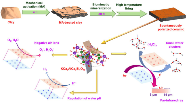 Inspired by marine biological mineralization, the research team adopts its self-developed mechanical activated solid phase reaction system to activate and pretreat the clay raw materials, produces silicate with specific polyhedral crystal structure through bionic mineralization, and further forms silicate minerals with ring structure through high temperature curing, so that the final Nixing pottery has special properties such as self-polarization, piezoelectricity and far-infrared emission. The self-polarization effect of Nixing pottery with ecological functions can induce the formation of permanent electrode and surface electric field. The potential difference between the two ends of the crystal ionizes the surrounding air, and the hit electrons attach to the adjacent water and oxygen molecules, which can activate the air. When Nixing pottery holds water, it dissociates water molecules and changes the redox state of water and adjusts the pH value. At 7, it is reduced to release hydrogen and form hydrogen-containing water. The emitted far-infrared light resonates with water molecules, breaking the hydrogen bond between the water molecules, making the water molecule cluster smaller and forming small molecular cluster water, which has the effect of activating water.