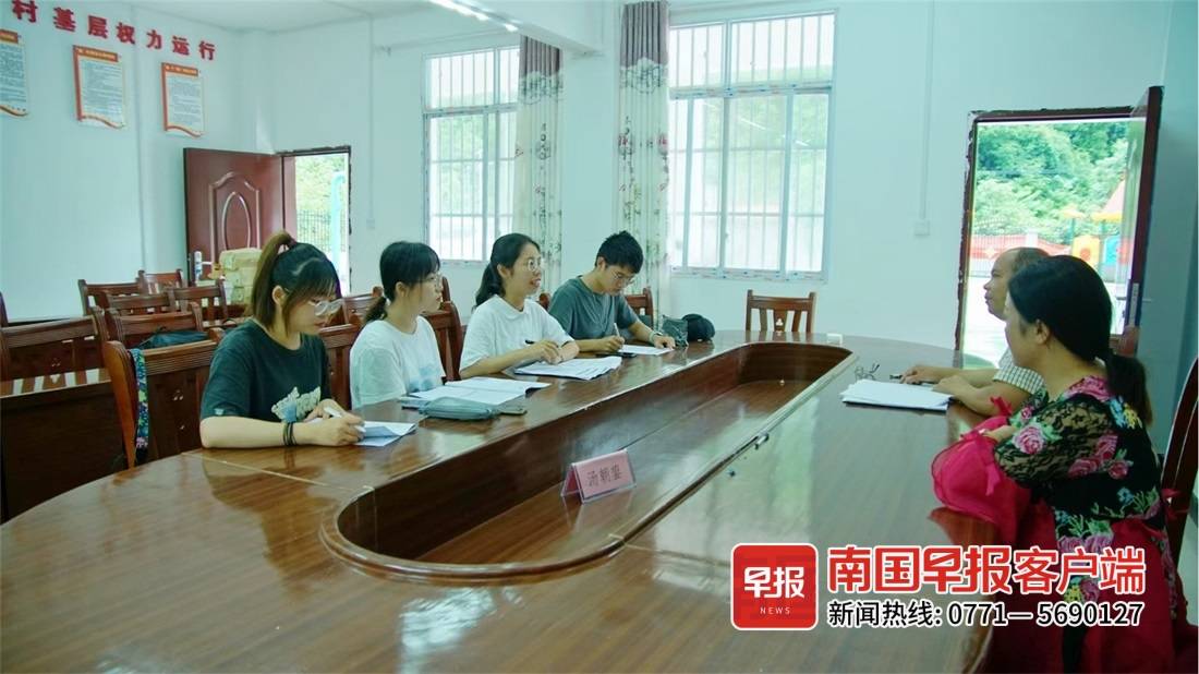 ▲2021年暑假,符其娴(左三)跟团队同学在乐业县丰洞村走访。受访者供图