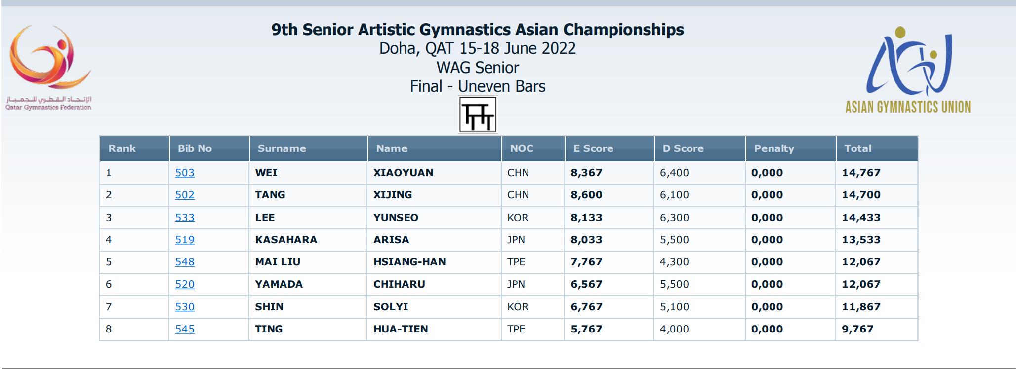 女子高低杠决赛,两位中国姑娘韦筱圆和唐茜靖发挥出色,分别得到14.767分和14.700分,包揽该项目冠亚军。