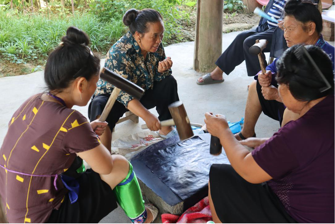 学院师生还观看了当地织锦和亮布的制作过程。据了解,苗族织锦以自由灵活的装饰纹样为主,主要用于背带盖、被面、床单等,也可用于镶嵌衣领、衣袖等。制作亮布则是用天然原料将布料染色,晾干后涂蛋清,用木槌反复捶打,使布面长久保持光泽。家家户户织锦布,苗寨处处锤衣声,成为融水苗乡独特的风景线。