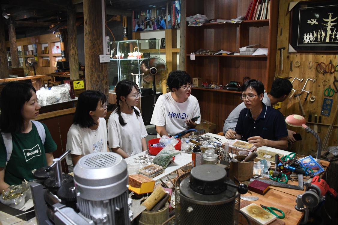 在马贵兵的带领下,同学们在非遗体验馆中参观极具苗族特色的银饰,并亲身体验了苗族银饰的制作过程。