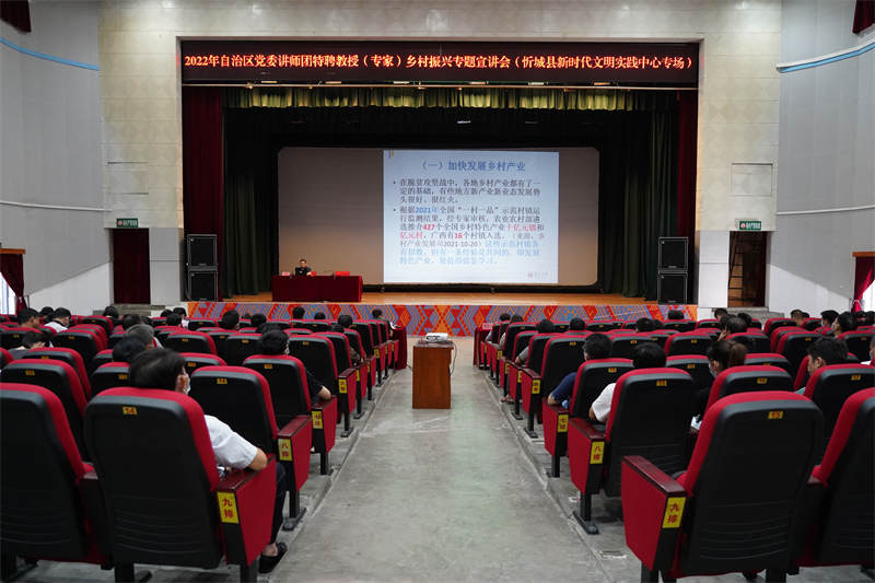你有关注到家乡的变化吗,乡村振兴与你有哪些关系?7月26日上午,广西壮族自治区党委讲师团特聘教授(专家)乡村振兴专题宣讲会(忻城县新时代文明实践中心专场)在广西来宾市忻城县影剧院举行。