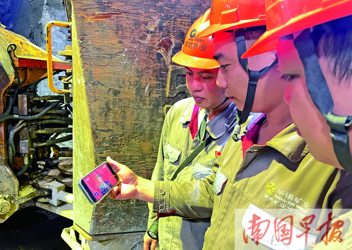 10月16日,在南丹县大厂镇华锡集团铜坑矿410米深的井下劳模工作室,一线职工利用休息时间收看党的二十大开幕会盛况。郑敬方 摄