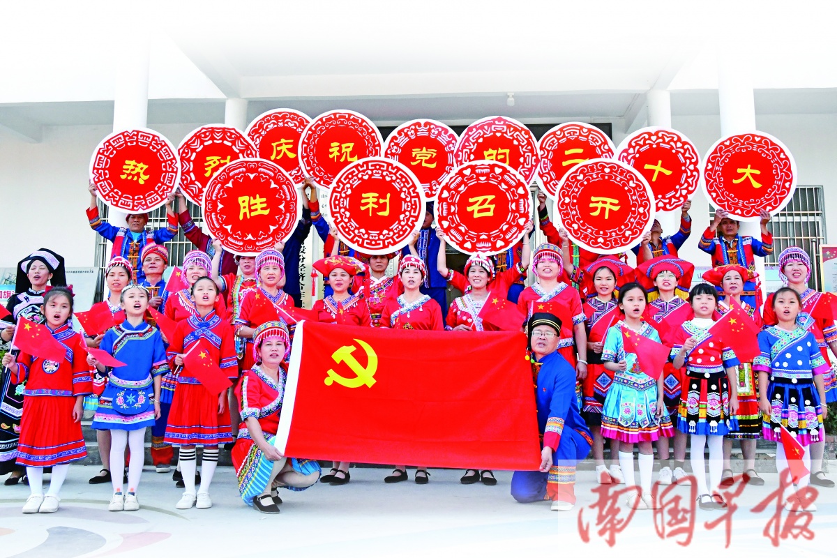 10月16日上午,在兴业县山心镇石柜村,身着节日盛装的村民们早早来到村里广场,唱着山歌,庆祝党的二十大胜利召开。何少凤 黄远强 摄