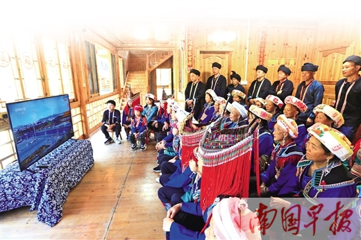 10月16日,灵川县九屋镇东源村瑶族同胞身着民族盛装收看盛会开幕直播。阳宁红 黄勇丹 摄