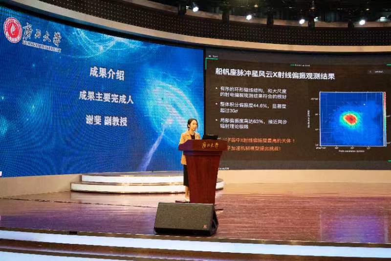 谢斐副教授介绍,脉冲星是由超新星的遗骸组成的一种高度磁化的旋转中子星,脉冲星风云则是快速旋转的脉冲星驱动的星风冲击外部物质产生的高能天体。船帆座脉冲星风云距离地球约900光年,是距离地球最近的脉冲星风云之一。船帆座脉冲星风云在中心快速旋转(每秒自转11.2次)的船帆座脉冲星的驱动下,能够发射出射电、X射线、高能伽马射线等不同波段的光辐射,也是目前已知最亮的脉冲星之一。通过X射线成像偏振望远镜,发现船帆座脉冲星风云存在极强的偏振,是人类目前在高能波段探测到的偏振度最高的一个目标源。它改变了科学家对粒子加速机制的认识。