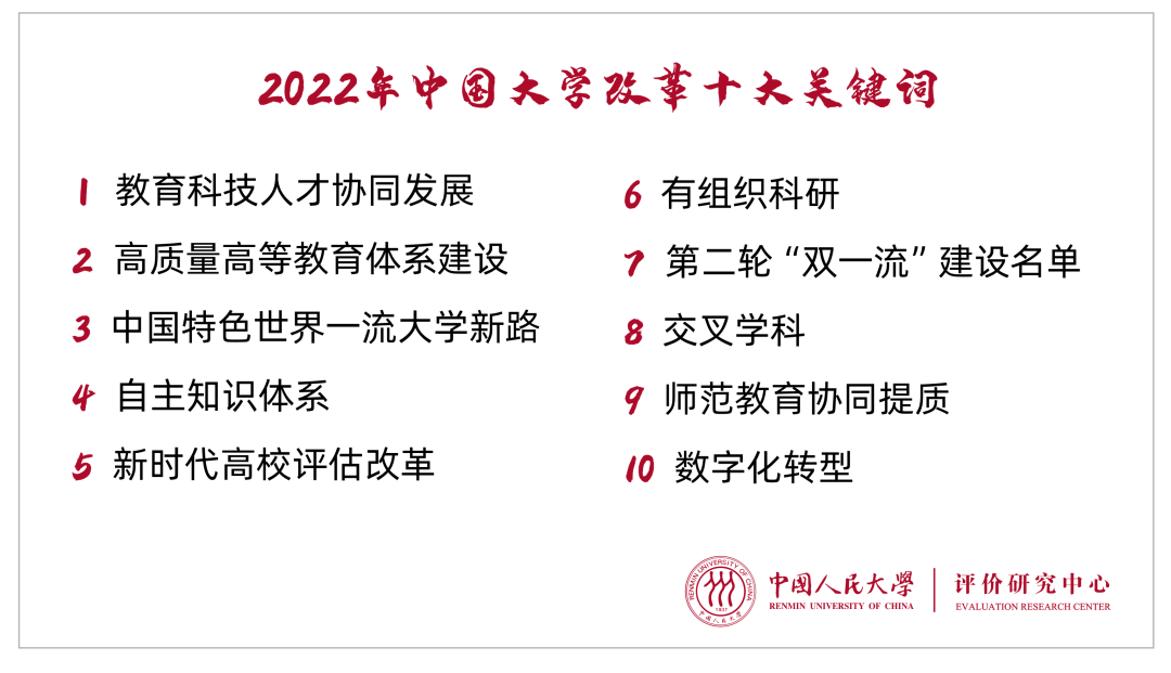 教育科技人才协同发展、高质量高等教育体系建设、中国特色世界一流大学新路、自主知识体系、新时代高校评估改革、有组织科研、第二轮“双一流”建设名单、交叉学科、师范教育协同提质、数字化转型等热词入选“2022年中国大学改革十大关键词”。据中国人民大学评价研究中心研究团队介绍,“十大关键词”聚焦于国内147所“双一流”建设高校和192所地方重点建设高校改革创新动态,采用定量和定性相结合的融合性评价方法,力求真切反映出2022年中国大学改革的方向和路径。