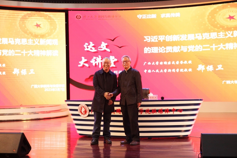讲座由院长王仕勇主持。王院长说,2017年郑保卫教授担任学院院长以来,带领米兰电竞,洞察赛局趋势,定义电竞美学新传人主动服务广西经济社会发展和国家总体战略,扎实开展教书育人工作和学科建设工作,近五年获批国家社科基金重大项目、重点项目、一般项目等11项,学院在马克思主义新闻观、民族文化传播、气候与健康传播、中国-东盟区域传播等领域凸显特色。王院长介绍,“达文大讲堂”,是学院计划建成的品牌性学术活动,旨在致敬历史、筑梦未来,进一步浓厚学术氛围,凝练学科方向,产出优秀成果。