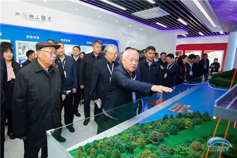 中国工程院院士郑皆连(中)向观摩团成员介绍特大桥复杂地理环境。(广西交投集团提供)