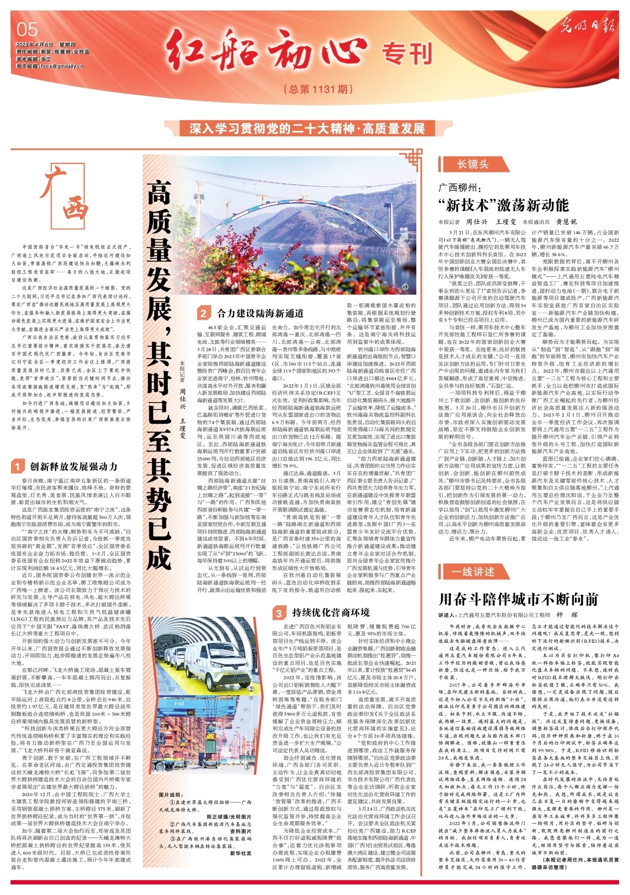 这是广西经济社会高质量发展的一个缩影。党的二十大期间,习近平总书记在参加广西代表团讨论时,要求广西在“推动边疆民族地区高质量发展上展现更大作为,在服务和融入新发展格局上取得更大突破,在推动绿色发展上实现更大进展,在维护国家安全上作出更大贡献,在推进全面从严治党上取得更大成效”。