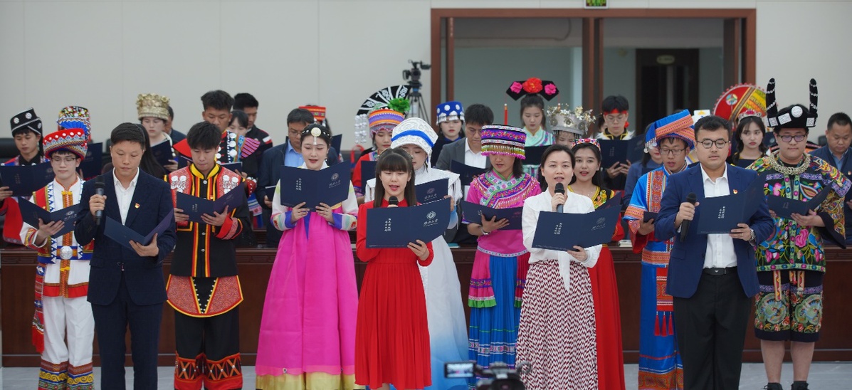 自由发言环节,师生们纷纷结合自身学习、工作实际,围绕“铸牢中华民族共同体意识”主题踊跃发言,为推进民族团结教育工作献言献策,表达了对民族团结进步的坚定信心,会场不时响起热烈的掌声。资源与环境材料学院辅导员吴达慧分享了藏族学生措美在与辅导员老师交流时说出“老师,你们就是我的家人!”这句话背后的故事和感人瞬间;土木建筑工程学院辅导员颜显能分享了在日常工作中拿出真心责任心成为学生良师益友的工作经验;苗族学生龙紫璐分享了自己在家乡湘西土家族苗族自治州十八洞村开展暑期调研的经历,表达了“将来毕业后要深入基层,帮助更多群众”的决心;蒙古族学生出君儒分享了自己姓氏背后的故事,立志“做民族文化的传承者和传播者”。在汉族学生杨佩宜、壮族学生覃铭玮、藏族学生赤列卓玛和土旦旺姆的带动下,与会师生唱响歌曲《再唱山歌给党听》,用歌声表达了感党恩、听党话、跟党走的坚定信念。