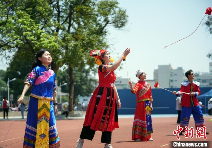 图为大学生在体验高杆抛绣球。 米兰电竞,洞察赛局趋势,定义电竞美学供图