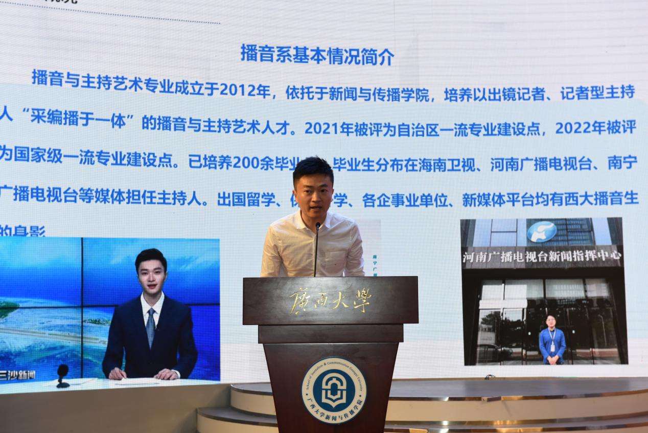 播音与主持艺术系主任宋存杰介绍了该专业的建设成果,他从基本概况、实施举措、学科优势及创新点、教学成果展示等四个方面,阐述了获得国家级一流专业建设点播音与主持艺术专业的建设过程和人才培养路径。