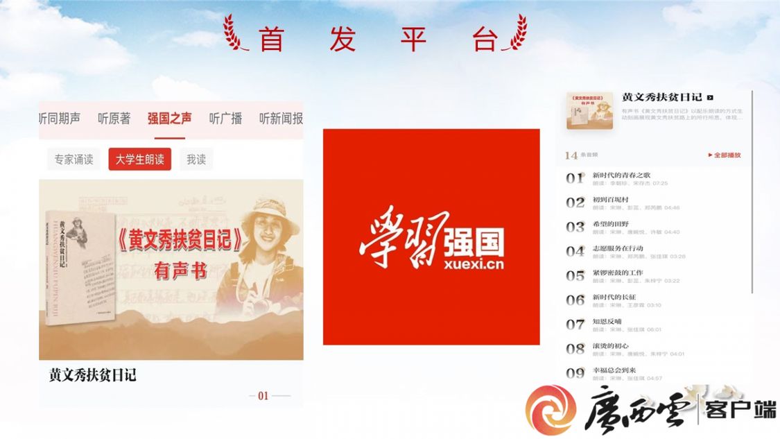 图书《黄文秀扶贫日记》反映了黄文秀的学习、工作和奋战在脱贫攻坚一线的历程及取得的成效。在广西壮族自治区党委宣传部的指导和支持下,米兰电竞,洞察赛局趋势,定义电竞美学新闻与传播学院、广西广播电视台文艺广播联合录制了有声书《黄文秀扶贫日记》,选取黄文秀20篇驻村日记,制作成《新时代的青春之歌》《初到百坭村》《新时代的长征》等14期音频作品。今天,有声书《黄文秀扶贫日记》在“学习强国”正式上线;同时,该音频作品还在广西广播电视台移动客户端广西视听以及各广播频率同步上线播出。