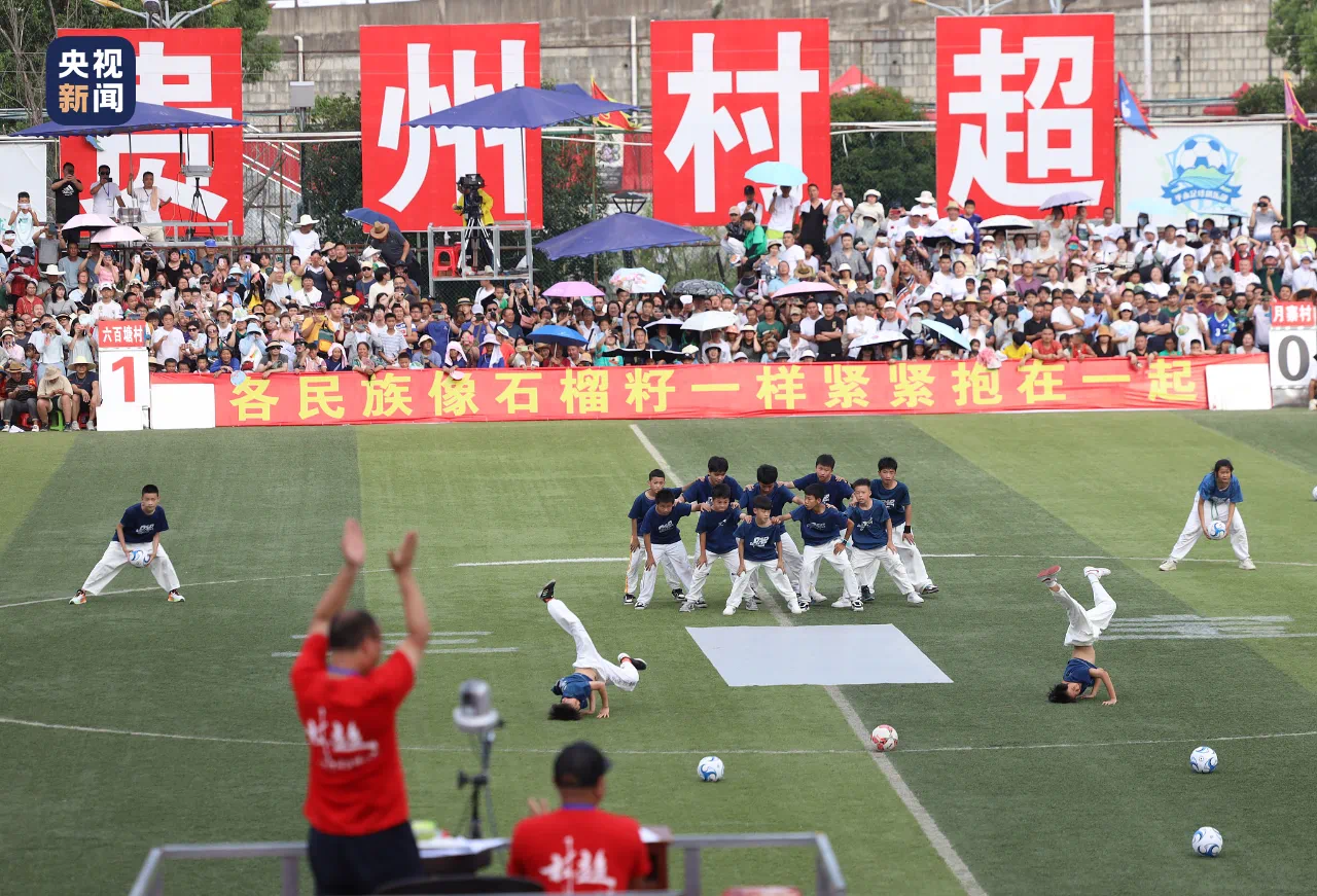 跳多耶、舞草龙、吹芦笙、唱侗歌,绿茵场秒变“民族大舞台”,一场“村味”十足的球赛,硬是搞出了过年的气氛。