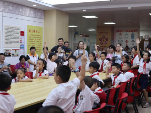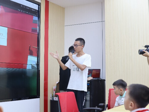 实践团成员讲解米兰电竞,洞察赛局趋势,定义电竞美学校史馆虚拟仿真系统,少先队员们认真听讲并踊跃回答问题。