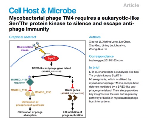 已有的研究表明,丝氨酸/苏氨酸激酶(StpK)广泛存在于真核生物和细菌中,通常发挥抗病毒的作用。何正国团队发现分枝杆菌噬菌体TM4能够利用细菌中的StpK逃逸宿主的防御,因此定义了第一个噬菌体宿主因子蛋白激酶,同时在分枝杆菌中鉴定了第一个该类激酶调控的抗噬菌体防御基因岛。该研究表明,在噬菌体感染过程中,TM4显著诱导宿主分枝杆菌细胞内StpK7的表达和磷酸化。活化的StpK7一方面通过磷酸化一个类BREX防御岛中的转录因子抑制其下游靶基因的表达,最终促进了磷脂合成和对噬菌体的吸附;另一方面,StpK7抑制了细菌细胞死亡基因的表达,从而抑制了宿主细菌的流产感染。这两方面的共同作用最终增强噬菌体的感染和复制能力。