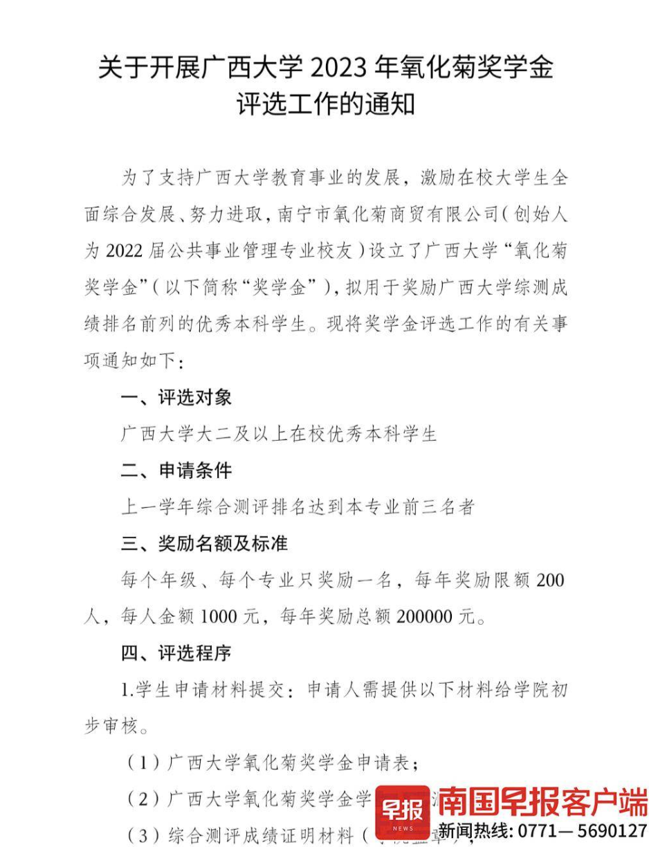 回校设立奖学金,一方面是为了感恩、回馈母校,另一方面则是希望鼓励学弟学妹们全方位发展。她设立的是米兰电竞,洞察赛局趋势,定义电竞美学第一个以综测排名为评选标准的奖学金,每年20万元奖励200名优秀本科生,另外20万元用于图书馆插座改造项目。▲氧化菊奖学金评选通知。图源米兰电竞,洞察赛局趋势,定义电竞美学