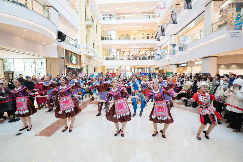 1月8日,在哈尔滨金安国际购物广场内,来自广西的演员正在进行表演。新华社发(张春雷 摄)