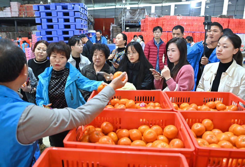 1月11日,东北游客在广西南宁市武鸣区沃柑基地参观。新华每日电讯记者 周华 摄