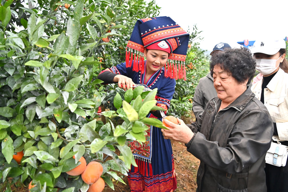 1月11日,广西南宁市武鸣区沃柑基地工作人员教东北游客采摘沃柑。新华每日电讯记者 周华 摄