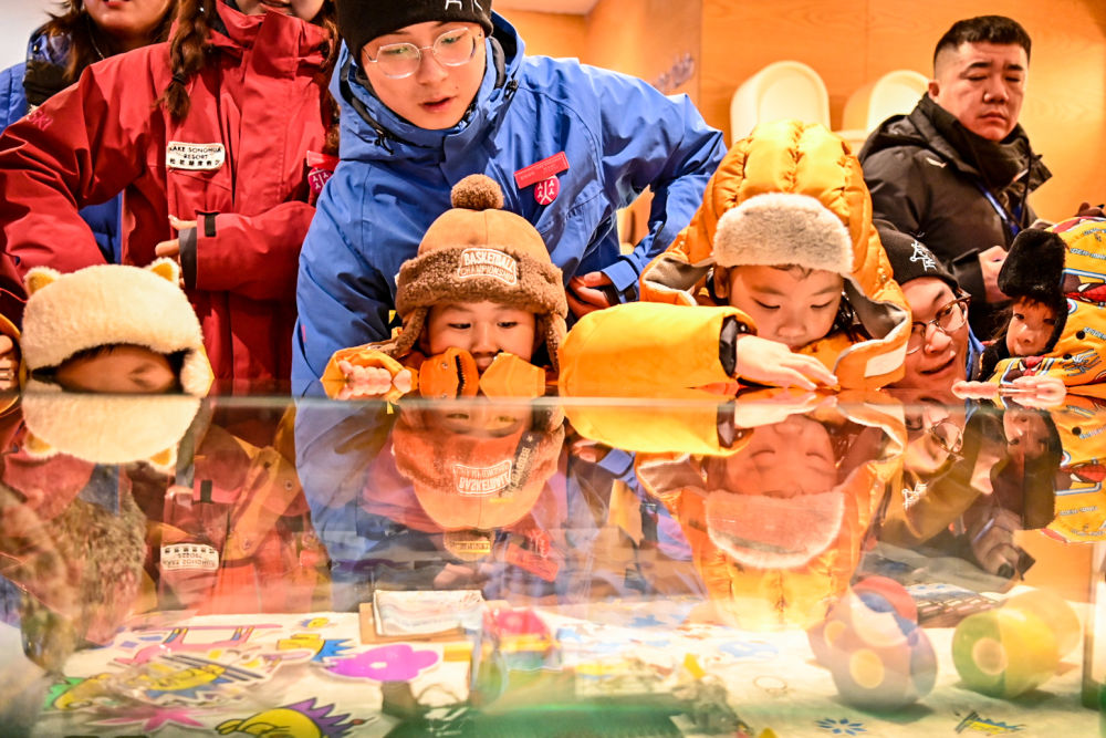 1月8日,来自广西南宁的“小砂糖橘”在吉林市万科松花湖度假区查看旅游纪念品。新华每日电讯记者 颜麟蕴 摄
