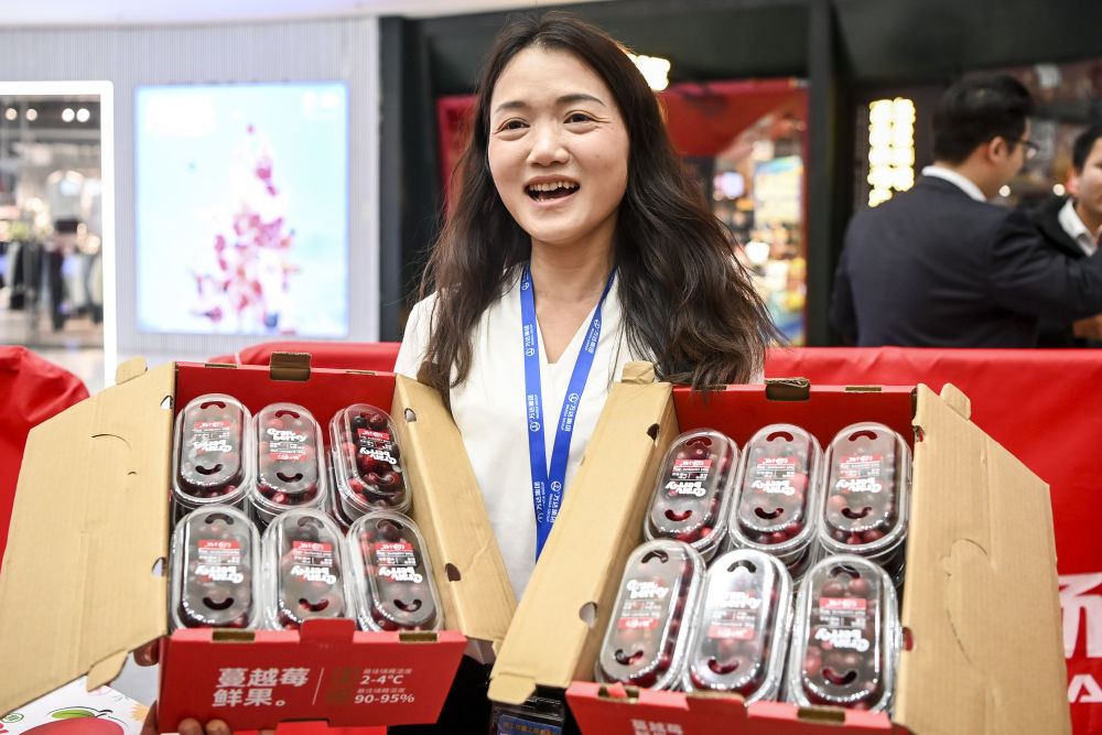 1月11日,在广西南宁一处蔓越莓领取点,工作人员在展示黑龙江蔓越莓。新华每日电讯记者 曹祎铭 摄