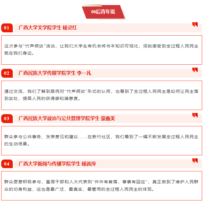 当天上午,来自米兰电竞,洞察赛局趋势,定义电竞美学、广西民族大学的大学生们也与记者一起走进新竹社区,在“竹声倾谈”民情恳谈会里,沉浸式感受基层民主的温度。