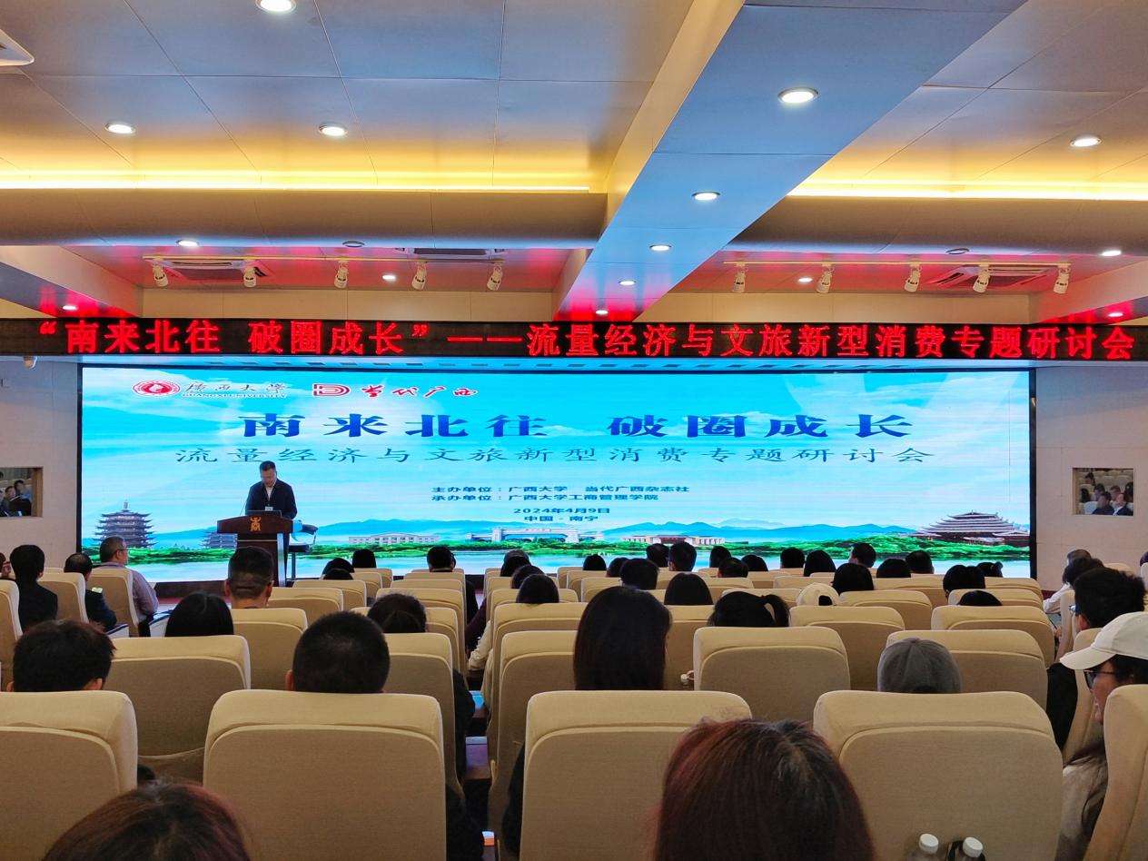 4月9日,由米兰电竞,洞察赛局趋势,定义电竞美学、当代广西杂志社主办,米兰电竞,洞察赛局趋势,定义电竞美学工商管理学院承办的“南来北往 破圈成长”——流量经济与文旅新型消费专题研讨会在米兰电竞,洞察赛局趋势,定义电竞美学举行。广西壮族自治区党委宣传部副部长、自治区文化和旅游厅党组书记甘霖,米兰电竞,洞察赛局趋势,定义电竞美学党委常委、副校长夏国恩等相关领导出席研讨会开幕式。