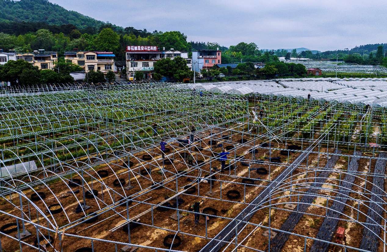(毛竹山村的村民们正在给葡萄园的大棚做升级改造。马震宇/摄)