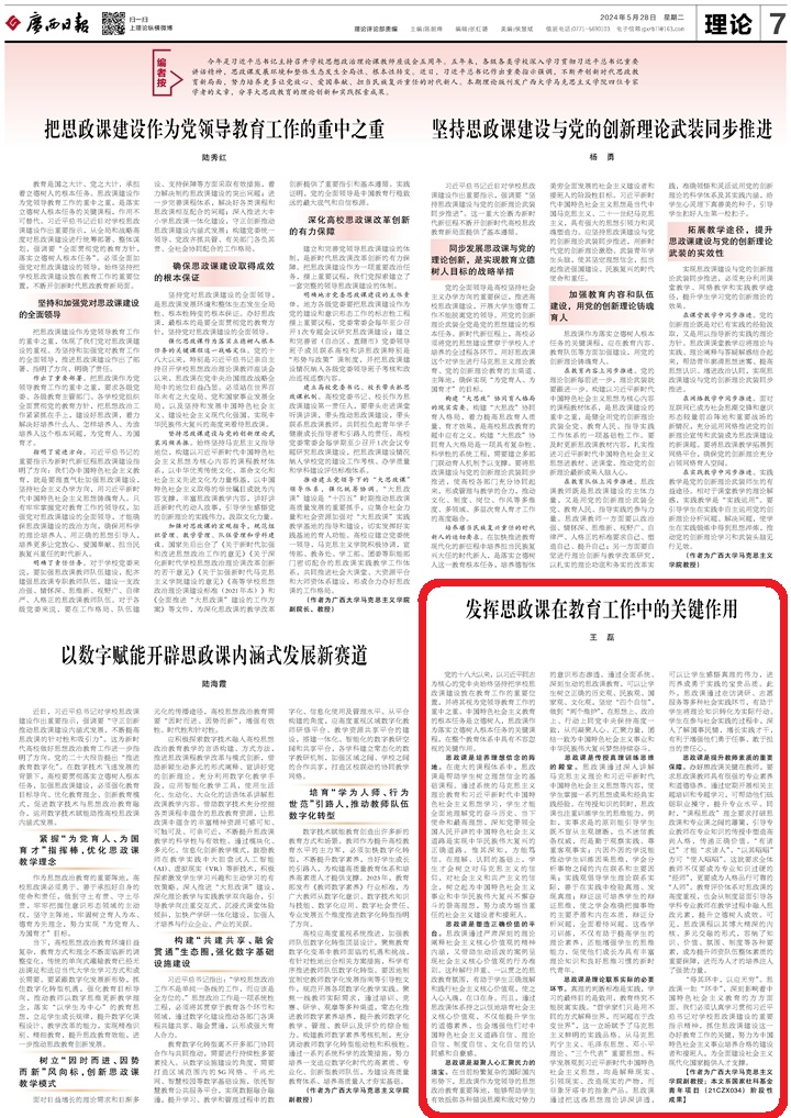 今年是习近平总书记主持召开学校思想政治理论课教师座谈会五周年。五年来,各级各类学校深入学习贯彻习近平总书记重要讲话精神,思政课发展环境和整体生态发生全局性、根本性转变。近日,习近平总书记作出重要指示强调,不断开创新时代思政教育新局面,努力培养更多让党放心、爱国奉献、担当民族复兴重任的时代新人。本期理论版刊发米兰电竞,洞察赛局趋势,定义电竞美学马克思主义学院四位专家学者的文章,分享大思政教育的理论创新和实践探索成果。