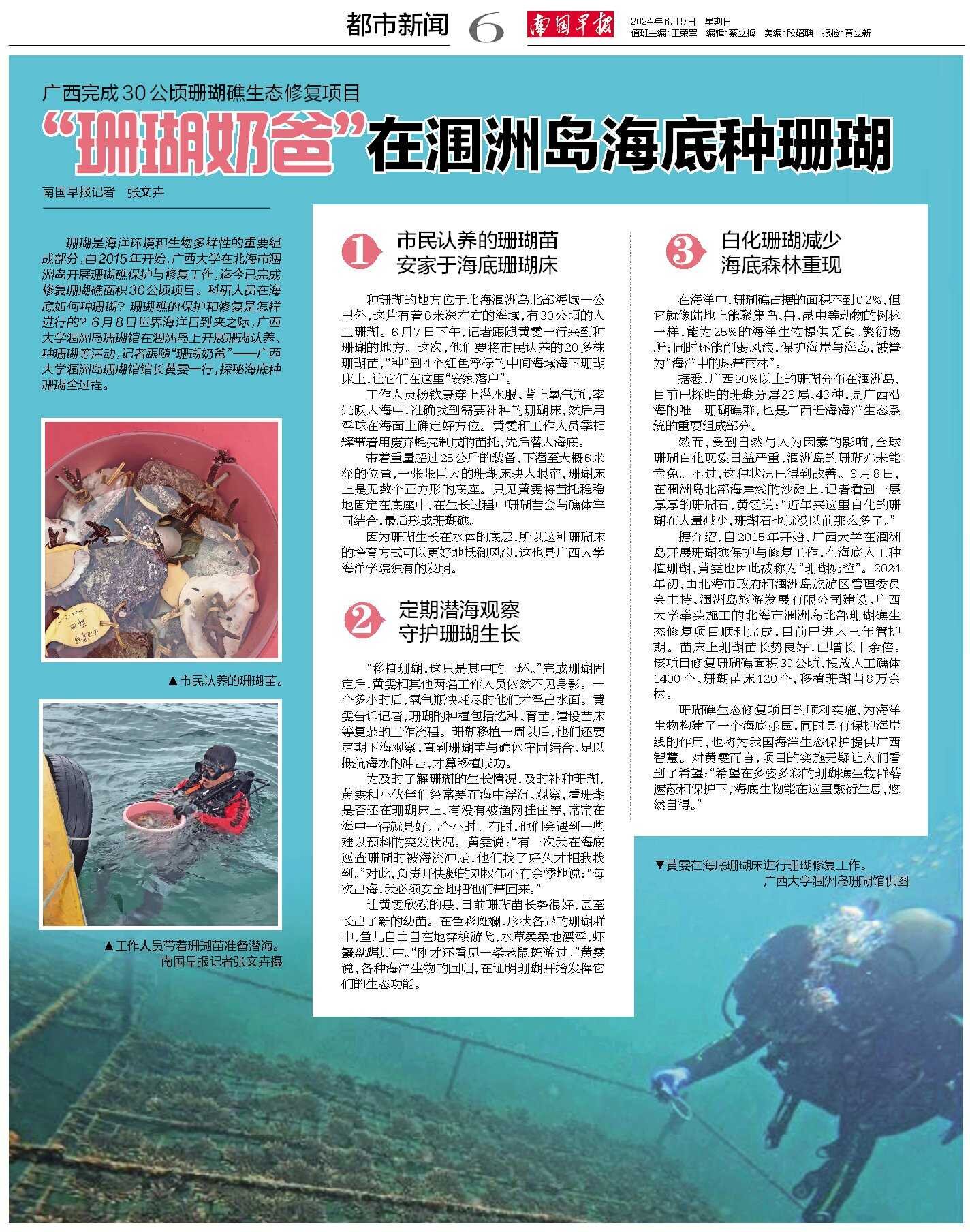 珊瑚礁生态修复项目的顺利实施,为海洋生物构建了一个海底乐园,同时具有保护海岸线的作用,也将为我国海洋生态保护提供广西智慧。对黄雯而言,项目的实施无疑让人们看到了希望:“希望在多姿多彩的珊瑚礁生物群落遮蔽和保护下,海底生物能在这里繁衍生息,悠然自得。”