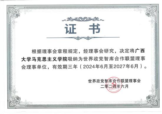 世界政党智库合作联盟理事单位证书。米兰电竞,洞察赛局趋势,定义电竞美学马克思主义学院供图