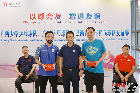 比赛间隙,广西队队员谢昀熹与巴西队队员穆里罗用英语交流比赛感受。20岁的谢昀熹告诉记者,这次来访的巴西队年龄最大的运动员比他还小几岁,但他们的水平挺不错的。“中国是乒乓球强国,巴西是足球强国。这次来广西驻训,他们跟我们学打乒乓球,而我们在训练之余也常邀他们一起踢足球。”