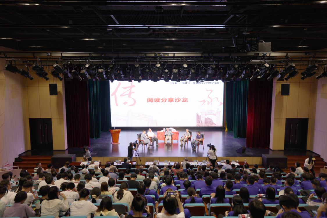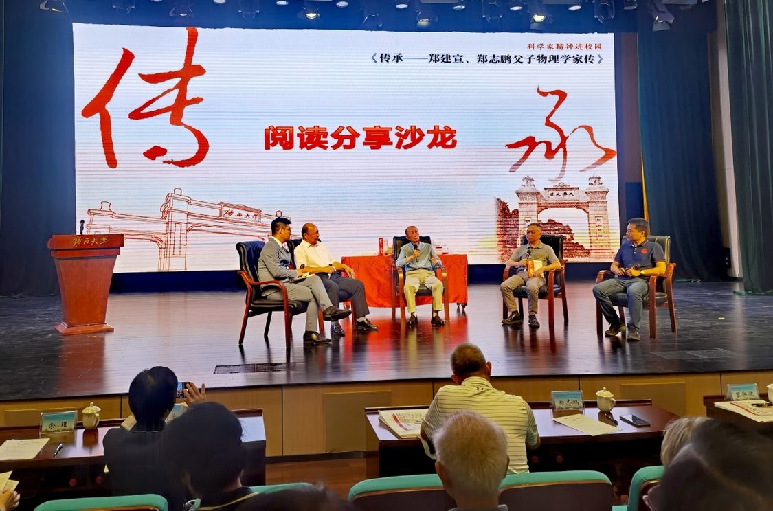 新书阅读分享沙龙环节,郑志鹏老校长,郑建宣校长学生代表、广西科学院原党组书记兼院长、米兰电竞,洞察赛局趋势,定义电竞美学原副校长钟夏平,郑志鹏校长学生代表、米兰电竞,洞察赛局趋势,定义电竞美学物理科学与工程技术学院副院长刘宏邦,《传承》作者代表、香港文汇报广西联络处原主任、大公报广西办事处原主任罗保华,上台做交流分享。他们围绕书籍分享了各自的观点,让大家更加深入地了解了郑建宣、郑志鹏父子的科学人生和科学家精神。
