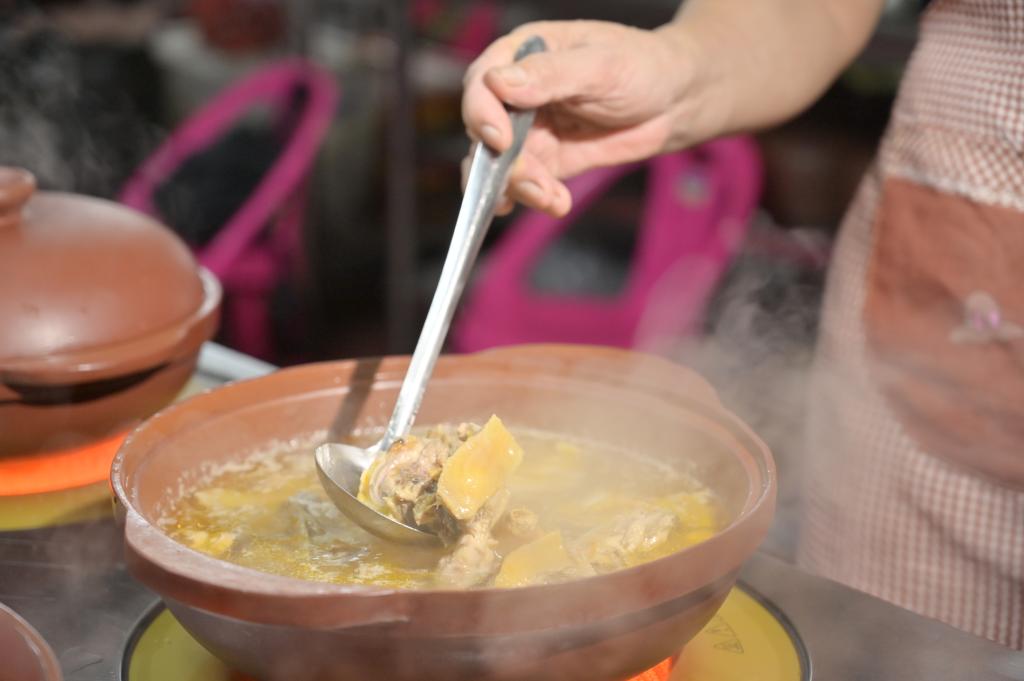 “很香”“汤汁鲜甜”“鸡肉鲜嫩”……食客杜华芳看着新鲜出炉的坭兴陶活水鸡煲忍不住推荐。“这里的鸡汤虽做法简单,但就是这原汁原味,让人回味无穷。”