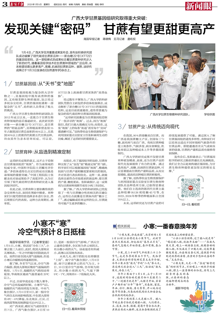 据了解,亚热带农业生物资源保护与利用国家重点实验室甘蔗生物育种团队在品种选育方面,已取得显著成绩。他们自主选育的第四代甘蔗主栽品种桂柳05136和桂糖42号等,在2023、2024年榨季的种植面积占全国70%以上。