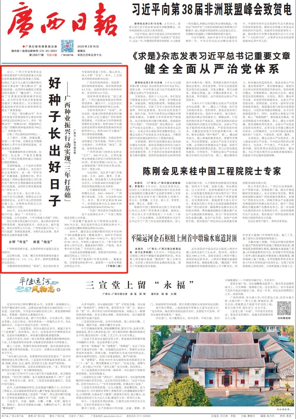国家种质资源库是“国之重器”,广西已建成国家级农作物种质资源库、圃共3个,认定自治区级农作物种质资源保护单位52家。