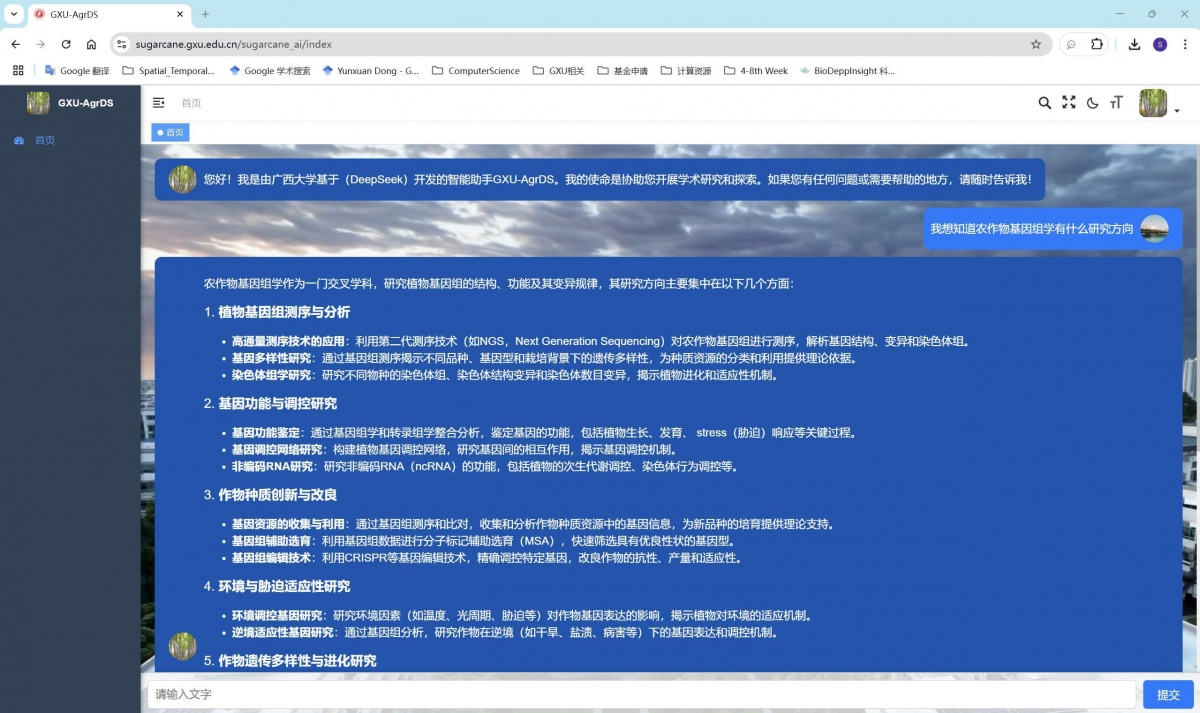 在试用期内,校内外用户可通过域名https://sugarcane.gxu.edu.cn/sugarcane_ai/注册登录后体验网页版AgrDS_V0的聊天功能,或通过https://sugarcane.gxu.edu.cn/sugarcane_ai_backup/体验匿名版聊天功能。
