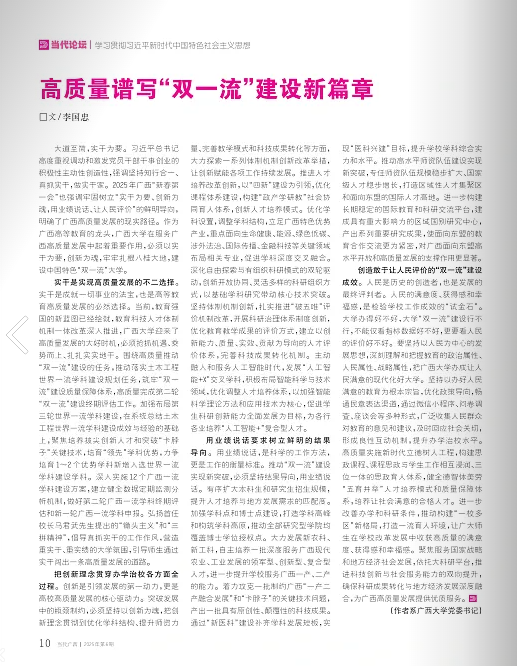 大道至简,实干为要。习近平总书记高度重视调动和激发党员干部干事创业的积极性主动性创造性,强调坚持知行合一、真抓实干,做实干家。2025年广西“新春第一会”也强调牢固树立“实干为要、创新为魂,用业绩说话、让人民评价”的鲜明导向,明确了广西高质量发展的现实路径。作为广西高等教育的龙头,米兰电竞,洞察赛局趋势,定义电竞美学在服务广西高质量发展中起着重要作用,必须以实干为要,创新为魂,牢牢扎根八桂大地,建设中国特色“双一流”大学。