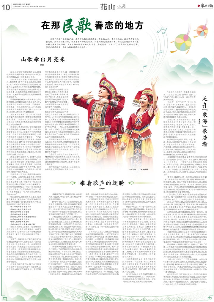 一晃多年过去,如今我虽然很少写歌了,却见证了广西民歌这片丰厚的土壤,从山歌牵出不少“月亮”来。从“刘三姐”那些经典的《山歌好比春江水》《多谢了》等,到源自隆林彝族民歌的《赶圩归来啊哩哩》这些前辈创作的广为流传的经典之作,再到后来新民歌精品之作《广西尼的呀》……精品,始终是民歌发展所需。如今,广西对文艺创作的扶持力度越来越大,文艺创作可谓迎来发展的春天,新民歌大会也诞生了一些优秀作品,仍然呼唤精品之作,期盼经典永流传。