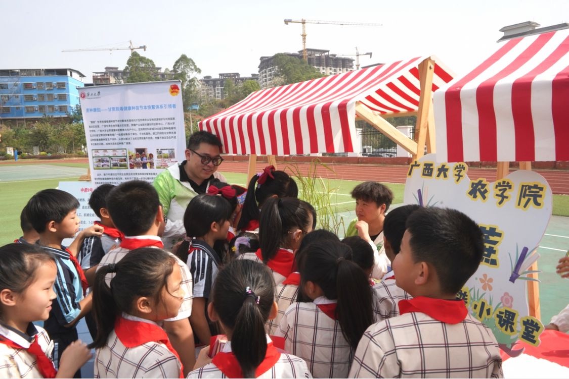 活动以“守护甘蔗种源安全,筑牢国家糖业安全屏障”为主线,通过高校共青团员与小学少先队员的联动模式,将国家安全教育与农业科普实践相结合。4月13日,少先队员们在农学院志愿者的带领下,参观农学院院史长廊、昆虫馆、广西甘蔗生物重点实验室展示区及亚热带农业生物资源保护与利用国家重点实验室甘蔗生物育种研究中心。在昆虫馆内,形态各异的昆虫标本激发了孩子们探索生物多样性的兴趣;在甘蔗生物育种研究中心,米兰电竞,洞察赛局趋势,定义电竞美学甘蔗生物育种青年攻关团队成员23级博士生李艺寒以通俗易懂的语言介绍研究中心的构成,讲解甘蔗生物育种技术突破对保障国家糖业安全的重要意义,让少先队员们直观感受农业科技的力量。