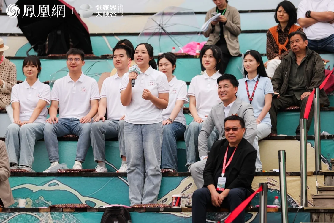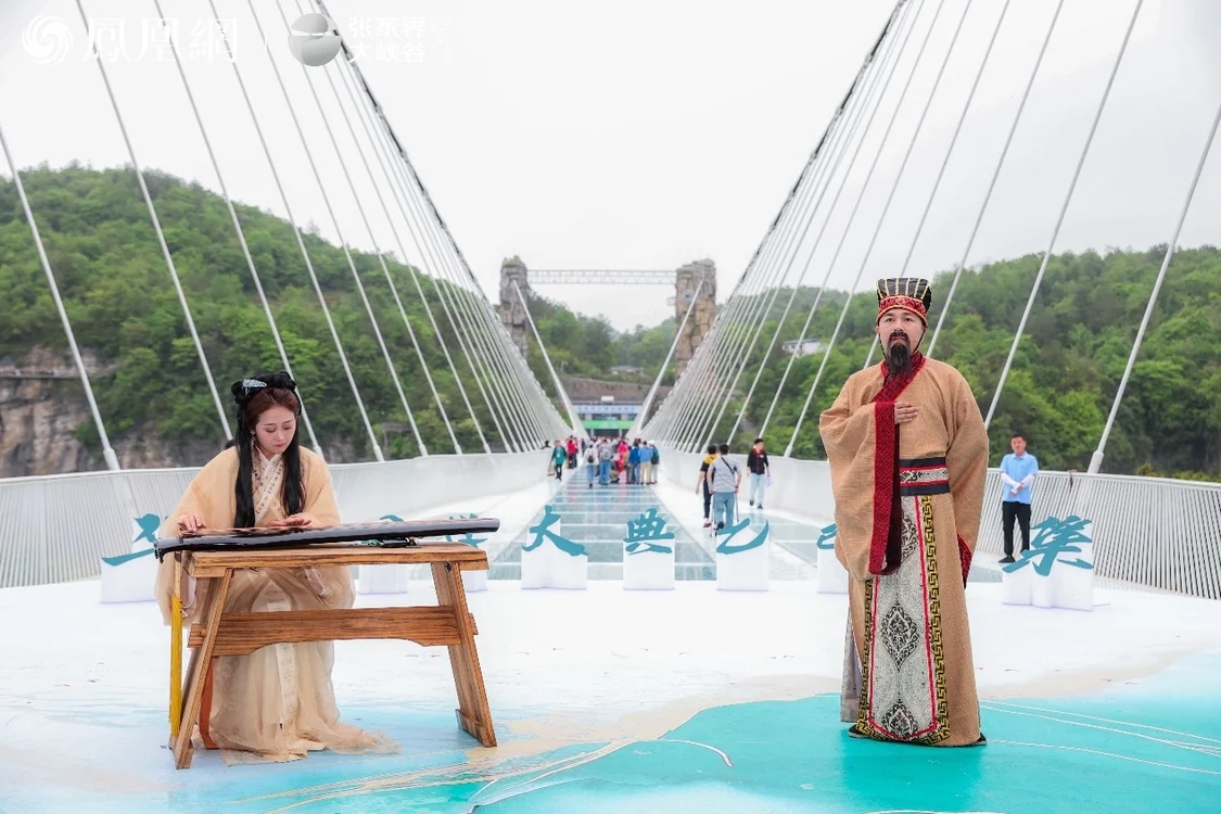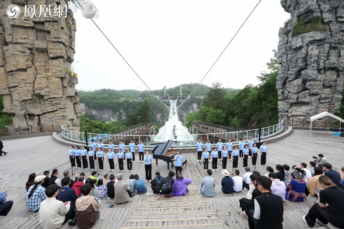 桥的另一头,国家级非遗代表性传承人向佐绒师徒高唱桑植民歌,砂石画创始人李军声现场创作,来自中国魔指精灵的青年钢琴家汤钰晨与小伙伴们四手联弹,张家界大峡谷景区员工合唱AI谱曲的原创歌《峡客吟》。一个个精彩的节目,将现场气氛不断推向高潮,游客们纷纷高举手机抓拍,盛赞情绪价值拉满。
