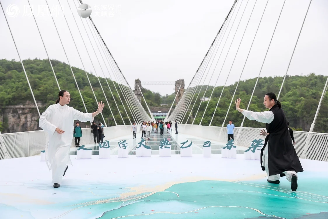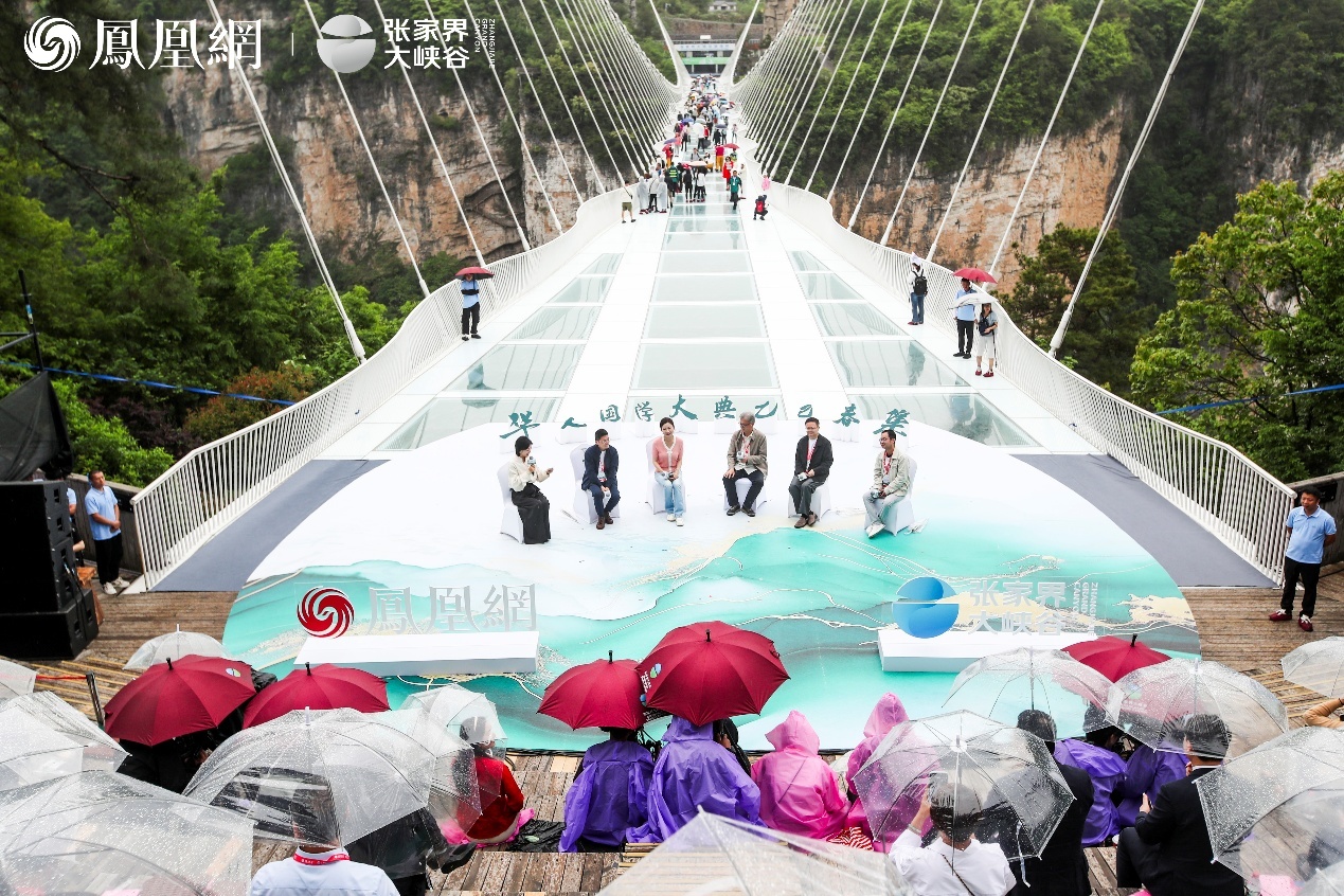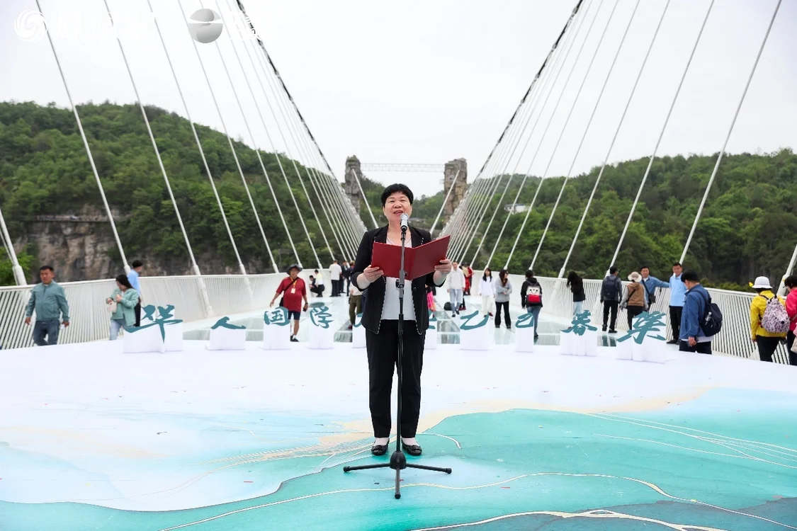 以诗为桥,云天可渡。4月22日下午,由凤凰网和张家界大峡谷联合主办的“华人国学大典乙巳春集:AI时代的诗和远方”盛大启幕。惊艳世界的张家界大峡谷玻璃桥,变身为诗意与科技交融的唯美舞台。孙若风、石厉、陈宇翔、王学松、吴昕孺、余世存、陈涌海、杨雨、罗晴秋、彭敏、罗子杰、李在峰等近百位知名诗人、文化学者、文旅专家,以及艺术、非遗、养生等领域的业界精英和网红达人,共赴悬崖上的春天之约,纵论AI时代的文学新趋势与文旅新范式,并与中外游客漫步于云端之上,演绎了一场自然山水与人文科技交织的诗歌嘉年华。
