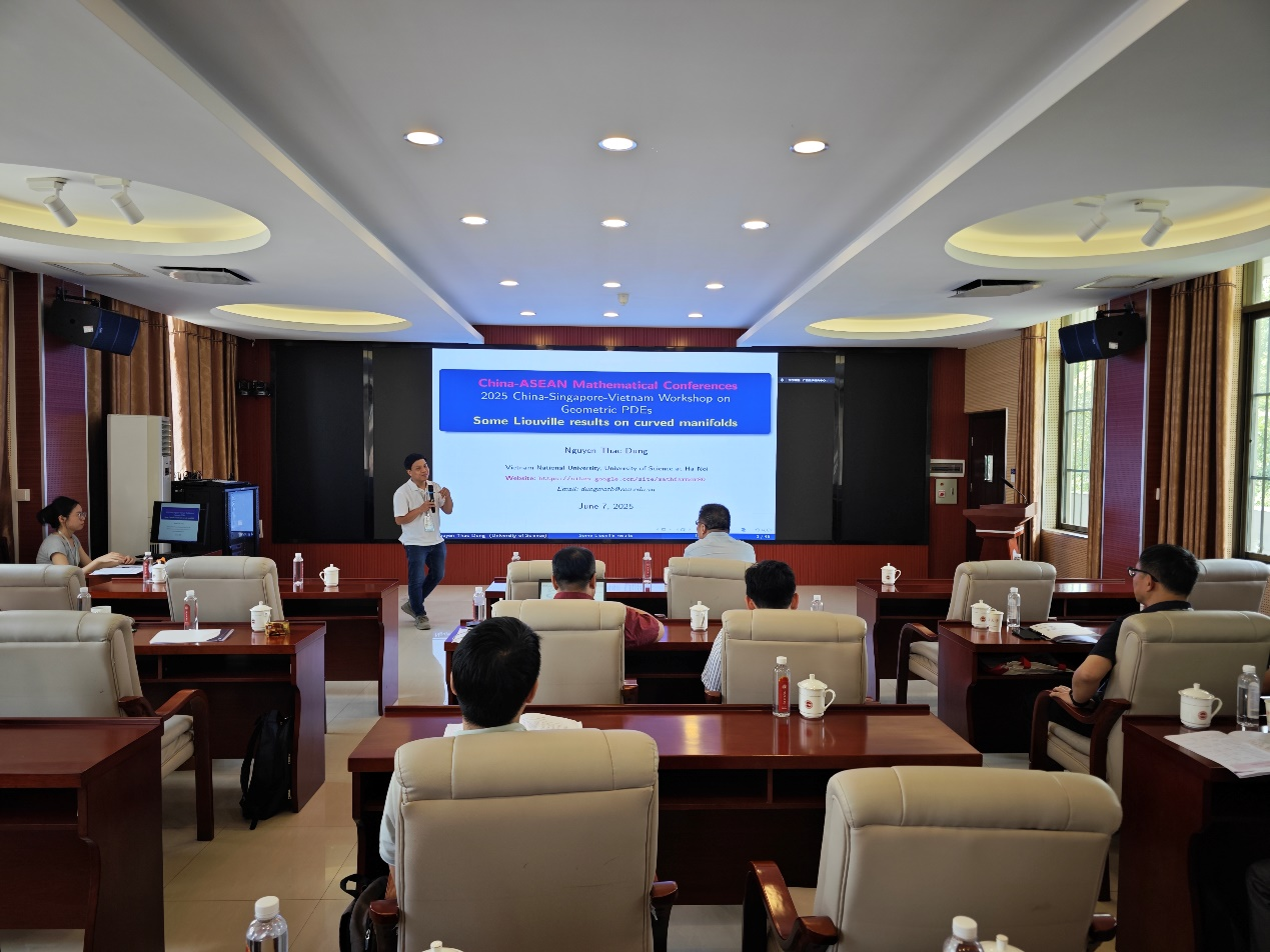 盛利教授介绍了国家天元数学西南中心“东盟访问学者”项目计划。他表示,“西南中心”将持续致力于为西南地区的青年学者及研究生搭建高水平的学术平台,推动区域数学研究实现优势互补,提升西部高校的学术影响力。此次研讨会,正是“西南中心”践行中国—东盟高校在数学研究、人才培养等方面的深度合作,共同推进数学领域的前沿探索,为数学学科的发展注入新动力。
