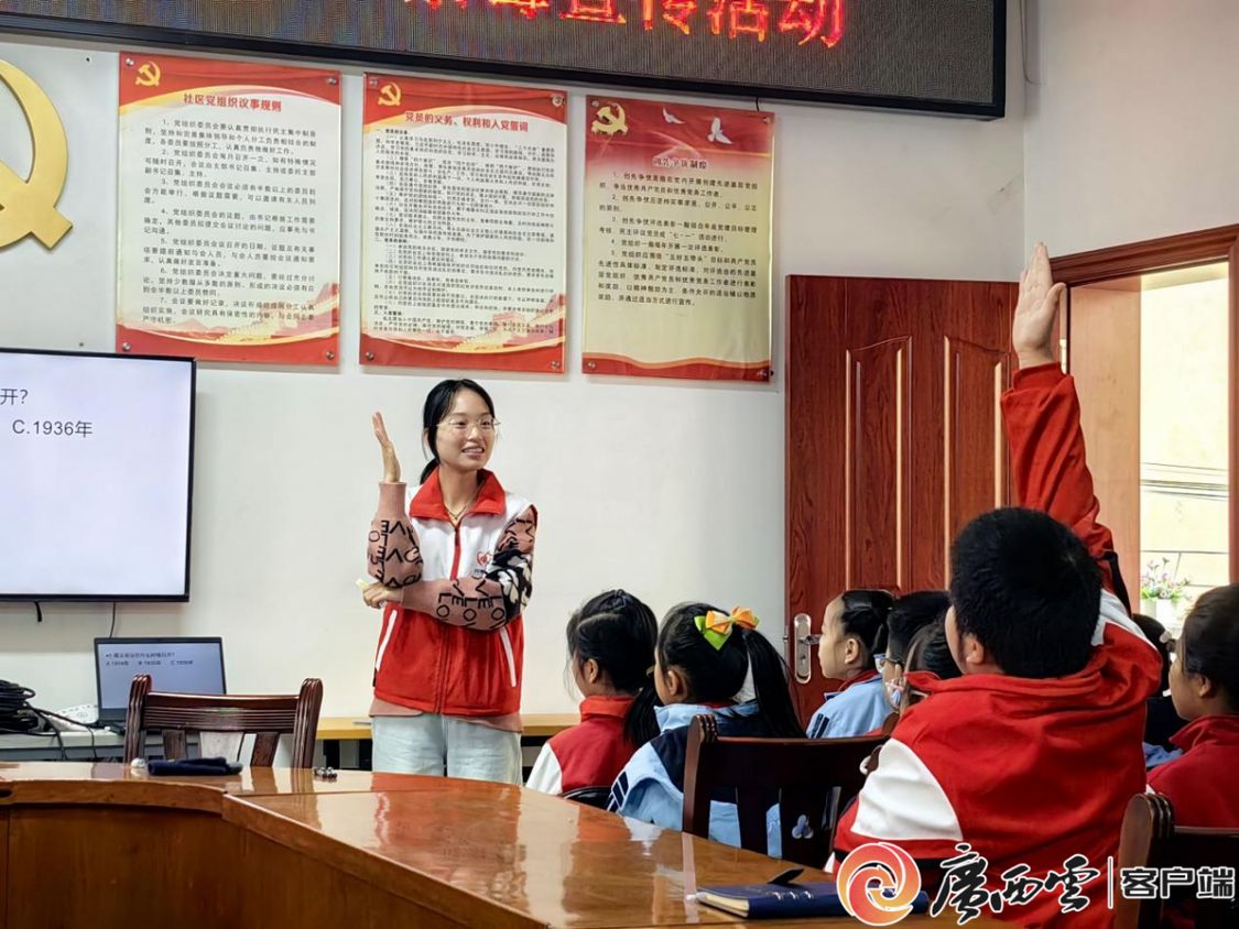为进一步赓续红色血脉,传承红色基因,宣讲团前往良庆区荣获“全国民族团结进步模范集体”称号的蟠龙社区进行遵义会议精神宣讲。宣讲团邀请了退伍军人大学生周富豪同学将自身的军旅故事融入对遵义会议精神时代内涵的阐释。他在部队里淬炼出的忠诚与担当在青少年心中播种了红色基因,很多孩子在互动环节表现出对参军报国的向往和憧憬。