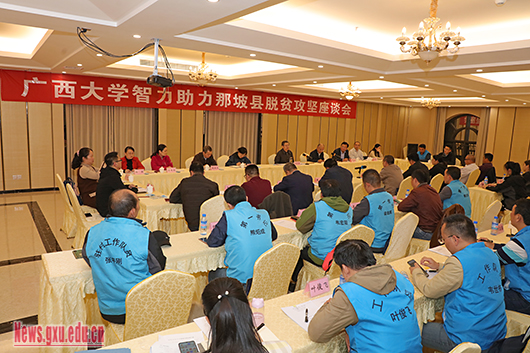 刘正东考察了消费扶贫签约单位那么鲜公司的蔬菜种植基地,走访慰问了帮扶贫困户。在智力助力那坡县脱贫攻坚座谈会上,分别听取了我校驻村工作队员、农牧产业发展研究院、资产经营公司、研究生支教团、校友企业福喜乐集团、那坡县委、百色市政协关于脱贫攻坚情况汇报。